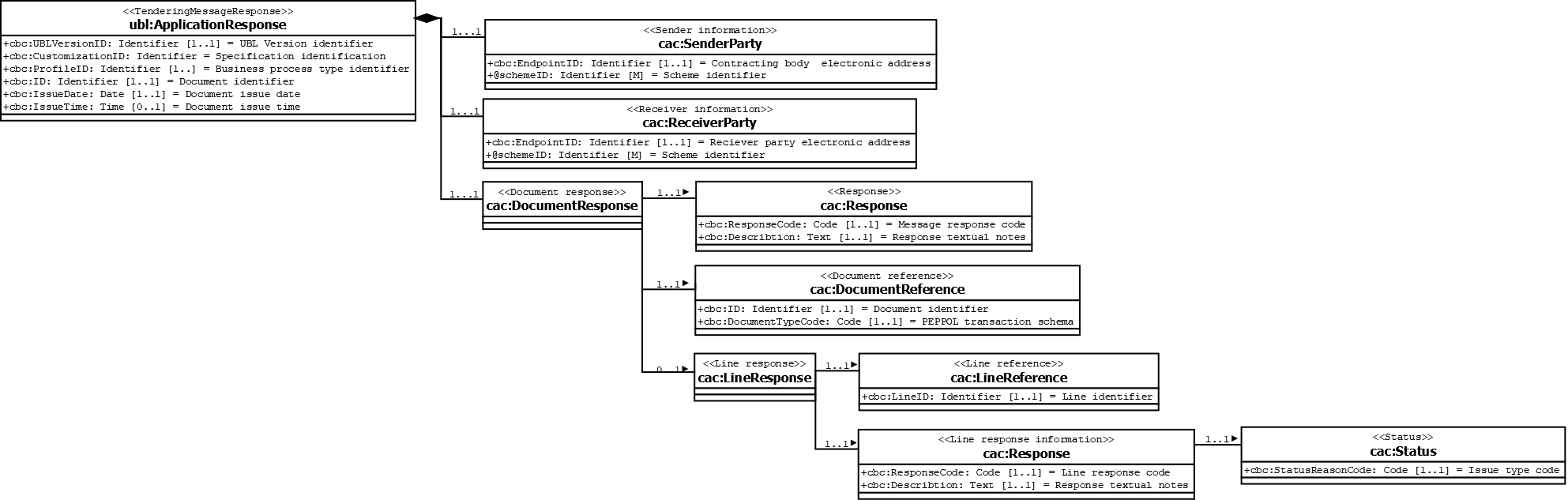 The data model and syntax mapping for Tendering Message Response can be found at Syntax mapping for T018 - Tendering Message Response 1.1. The data model and syntax mapping explains how to use the UBL (or an underlying syntax) to support the Tendering Message Response information transaction requirements. It provides the syntax mappings from each UBL (or syntax) element to the Tendering Message Response information elements of this transaction.